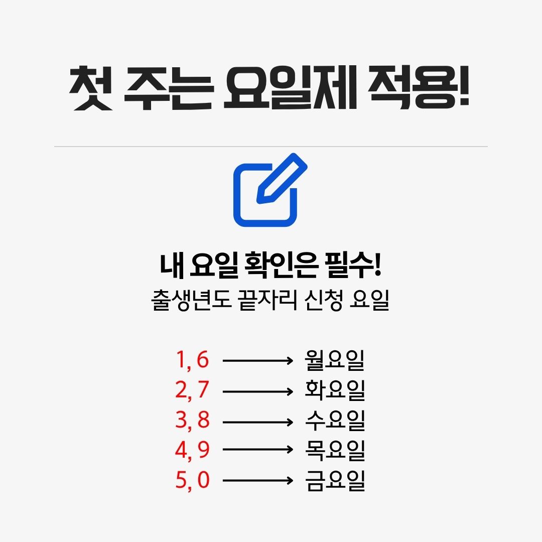 신청 첫 주인 7월 21일(월) ~ 25일(금)는 출생년도 끝자리 기준으로 요일제가 적용됩니다.